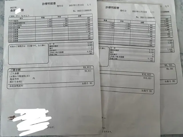 治療費(初診料、通院代、外科手術検査費用、等)