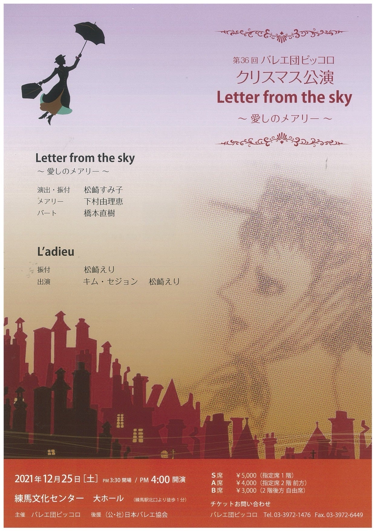 今年のクリスマス公演では『Letter from the sky』メアリーポピンズを題材にした作品を上演いたします。この作品はこれまでに松崎すみ子公演、日本バレエ協会でも上演されました。