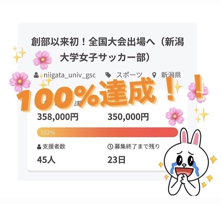 クラウドファンディングの支援金が目標金額の100%を超えました!ご支援いただいた皆さま、深く感謝申し上げます。皆さまからのコメント全て読ませていただいております!今回のクラウドファンディングを通して、改めて多くの皆さまに支えられていることを実感いたしました。クラウドファンディングを開始して5日目で、目標金額を達成することが出来、本当に感謝の気持ちでいっぱいです、、この気持ちを忘れずに全国の舞台でもサッカーを全力で楽しみたいと思います!