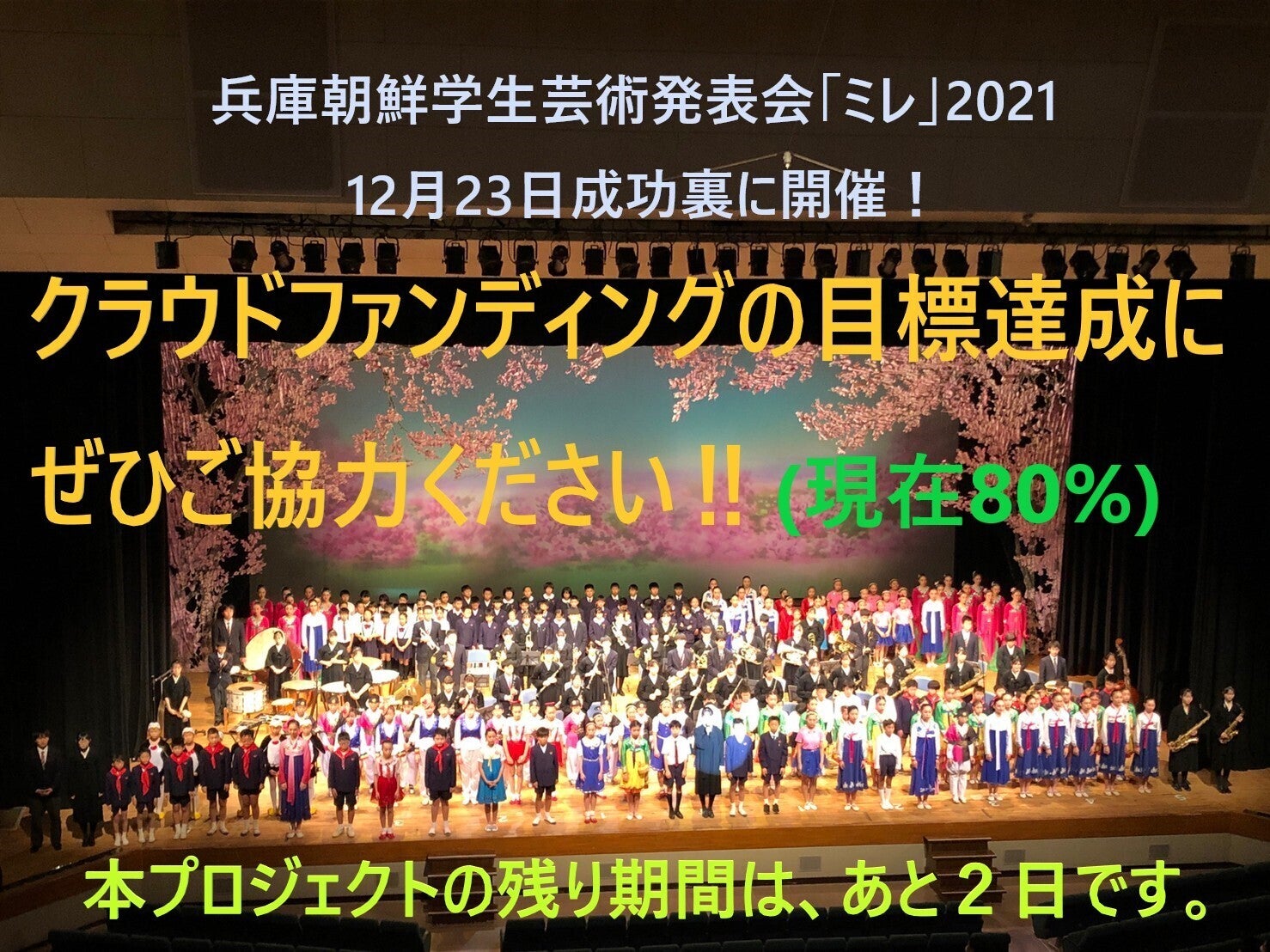 アンニョンハシンミカ!本プロジェクトにご支援くださった皆様、長らくお待たせいたしました。プロジェクトの募集終了から1ヶ月が経とうとしておりますが、ようやくリターン品をお送りする準備が全て整い、本日Eメールと郵送にてご支援者の方々にお送りいたしました。お礼のメッセージ(PDF)、メッセージカード(PDF)、発表会ライブ配信映像保存動画URL、ミレ発表会2021プログラム(PDF)、公演DVD(郵送)などをお受け取り下さり、内容のご確認をお願いいたします。本プロジェクトは、2月3日までに兵庫県下朝鮮学校と各校芸術クラブへの支援金等の伝達、2月5日(予定)にクラウドファンディング支援者一覧とプロジェクト完了報告を発表会出演者に配布する活動内容をもって完了となります。プロジェクトの完了まで、引き続きよろしくお願いいたします。--------------------------------------------------------------------------------------------------本実行委員会では、ミレ発表会2021の公演映像を編集し作成したDVDの注文を承っております。(ライブ配信映像とは別に編集、作成したDVDになります。)購入をご希望の場合は、実行委員会にEメール(hyogo.ks.mire@gmail.com)にてご連絡ください。