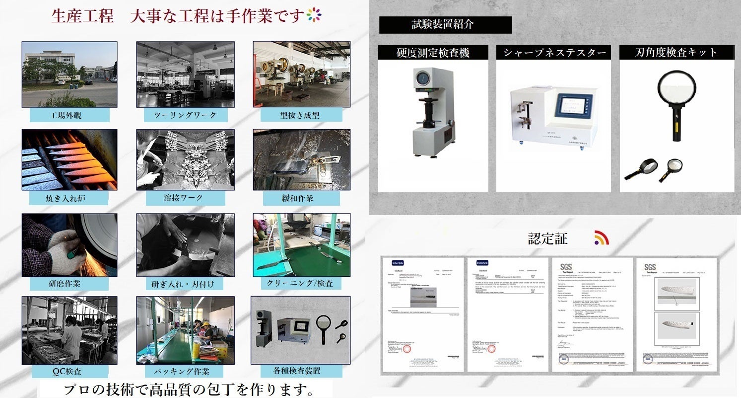 3) 自動パンチング、熱から設定された高度な包丁生産ラインを備えた現代的な工場を持つ処理、自動研削、製品組立ライン全体への自動シャーピング、テストラボも備えています。