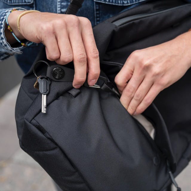 メイン収納だけでなく、フロントにもポケットを配備。マグネット式フラップで開閉がしやすくなると共に、止水ジップと組み合わせることで、イヤホンなどのガジェットの収納にも適しています。
