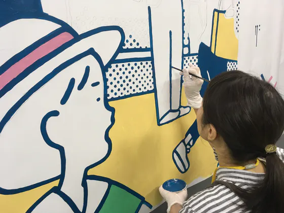 本日、都内某所のスペースを借りて、メイン部分のアートとなる作品の本塗りの検討会を実施しました。むらなく色を塗っていく方法や道具の選び方、色を重ねていく順番、ライン部分の描き方などを、アートディレクターを中心にメンバーで試しながら描いていきました。
