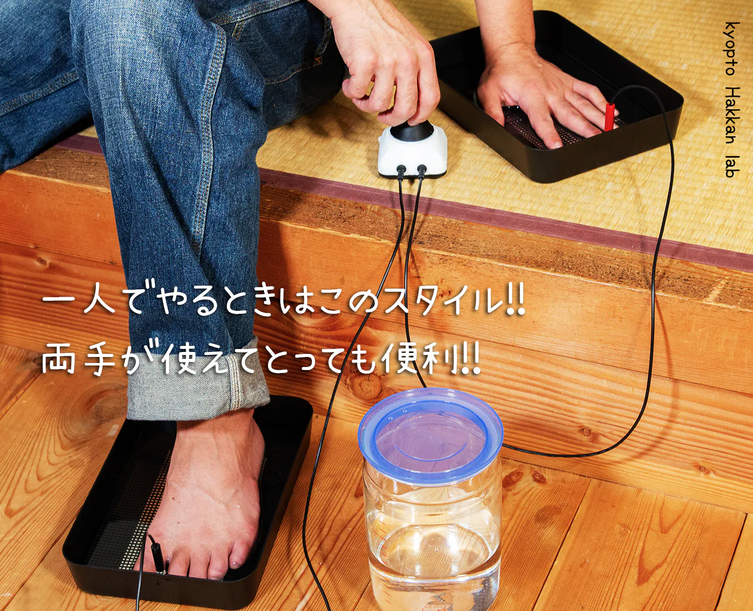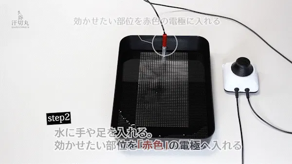 | step2 | 水に手足を入れる。※効かせたい部位を赤い電極の方へ。