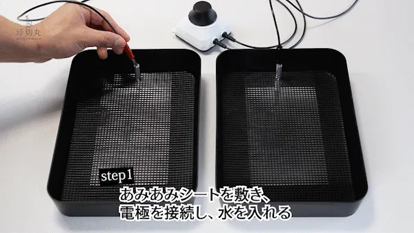 | step1 | 電極を汗切丸とつなぎ、バットに水道水を入れる。