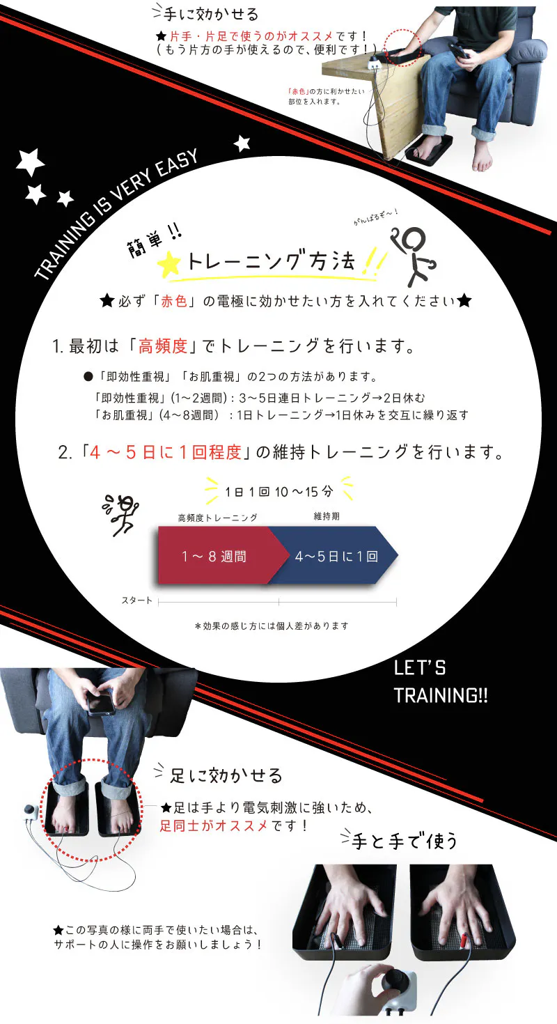 使い方は非常に簡単で、くつろぎながら毎日15分の電気式トレーニングを行うだけです。