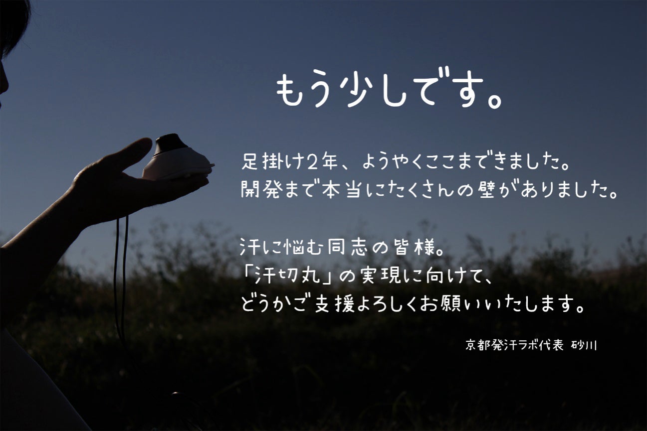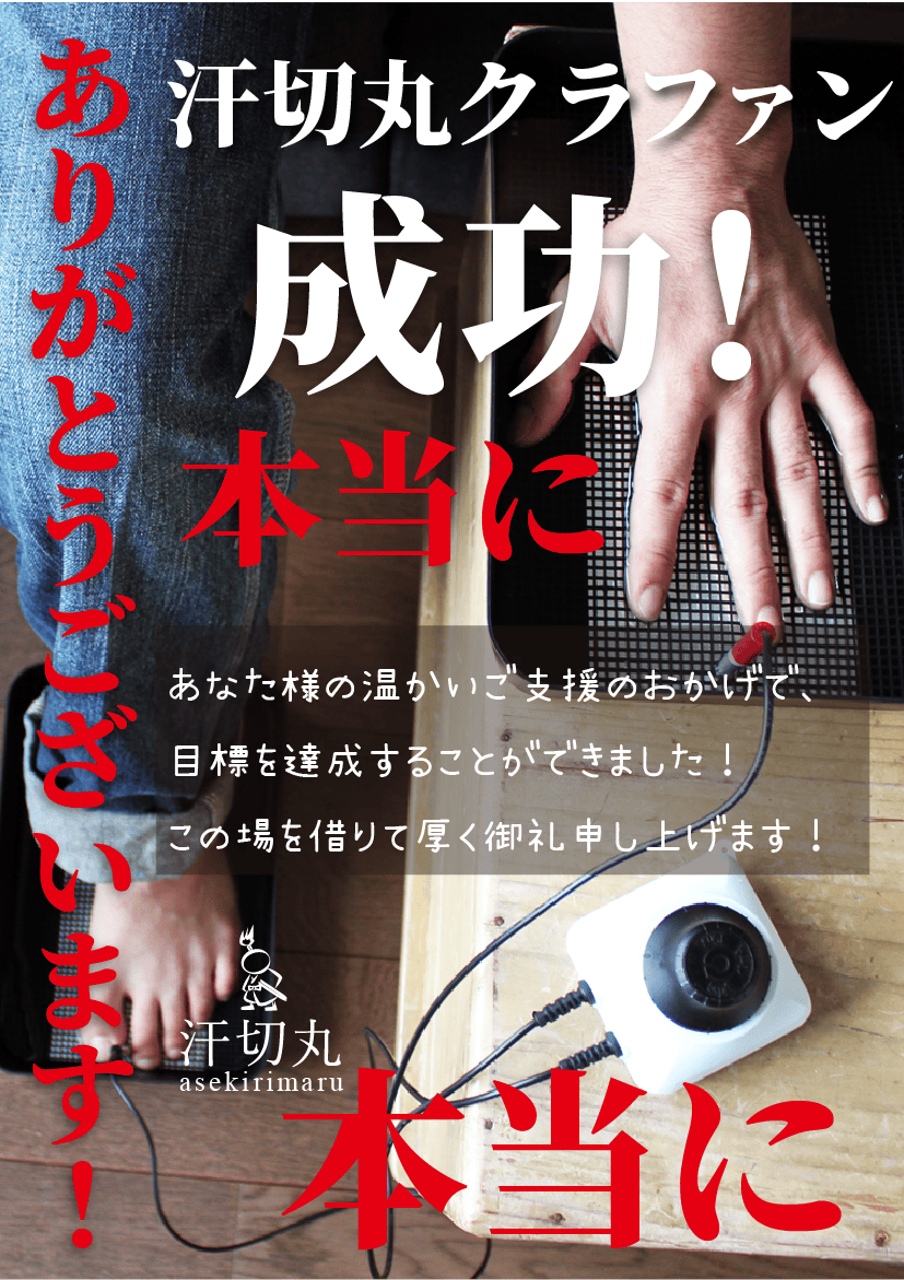 2022/01/31 14:10汗切丸クラファン成功いたしました!皆様の温かいご支援をいただき、本当に、本当に、ありがとうございます!初めてのクラファンで、このようなご支援をいただけて、大変感激しております。お一人、お一人の温かいご支援がなければ、決して達成することはできませんでした。1か月間、本当に色々なことがありました。クラファンの準備段階から考えたら、本当に数えきれないくらいのことがありました。その度に、応援していただいている皆様のことを思い出し、負けじまいと取り組んでまいりました。「汗切丸」に一番最初にご興味を持っていただき、スタートアップの私達のことを応援していただき、 本当に、本当に、ありがとうございます。この場を借りて、厚く御礼申し上げます!そして、これから生産に向けて活動を本格化していきます!適宜、進捗を報告させていただきますので、これからもどうぞよろしくお願いいたします!! もっと見る