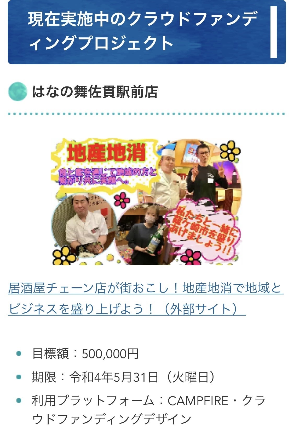 こんにちは!はなの舞佐貫駅前店です!当プロジェクトをご支援、また閲覧していただきありがとうございます!この度、龍ケ崎市役所ホームページの「クラウドファンディング応援事業」にて当店クラウドファンディングのプロジェクトを掲載していただいております!!https://www.city.ryugasaki.ibaraki.jp/shisei/machi-hito/crowdfunding.html掲載していただいたことにより、より多くの方に当プロジェクトを知っていただくきっかけを設けてもらい、誠に感謝しております。また上記ホームページには過去に龍ケ崎市で行われたプロジェクトも掲載されておりますので、ぜひ覗いてみてください(^^)引き続き、はなの舞佐貫駅前店のプロジェクトへのご支援よろしくお願いいたします!
