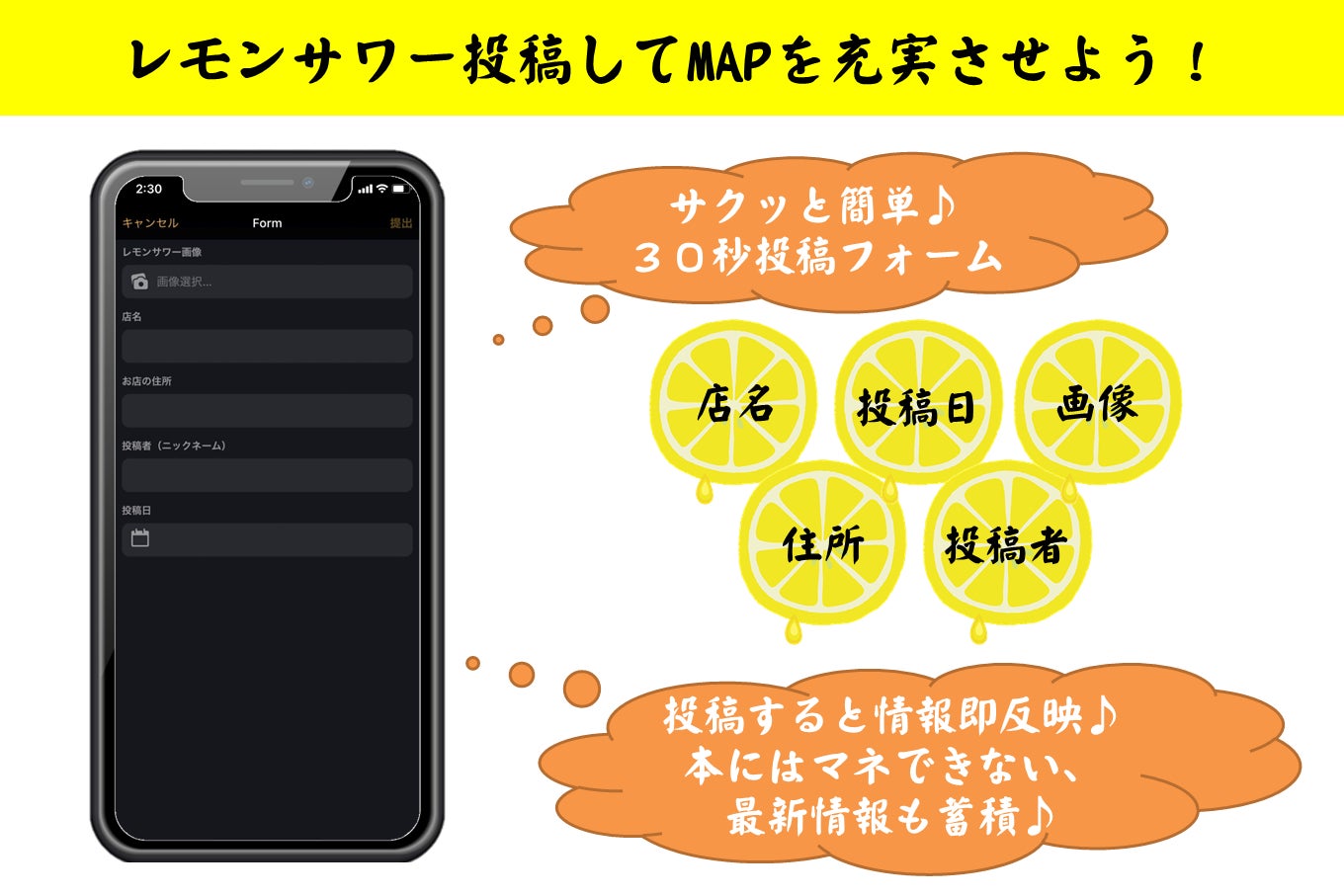 投稿項目(レモンサワー画像・店名・住所・投稿者・投稿日)を埋めて送信すると、