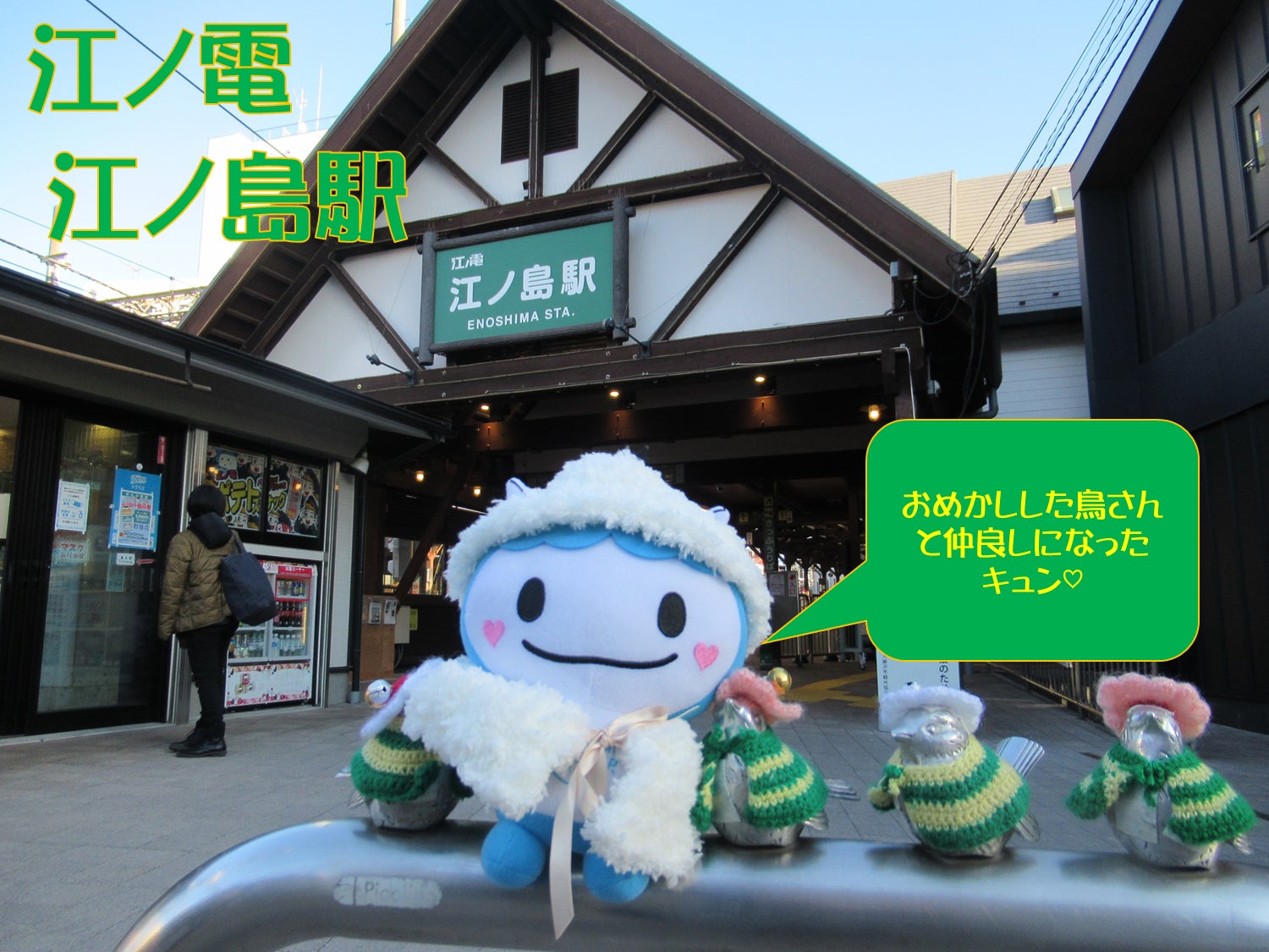 写真は駅を出てすぐのところなんだけど、車止めの上にいる鳥さんたちが服を着ておめかししててとっても可愛かったから、仲良しになって一緒に写真撮ったんだ♬