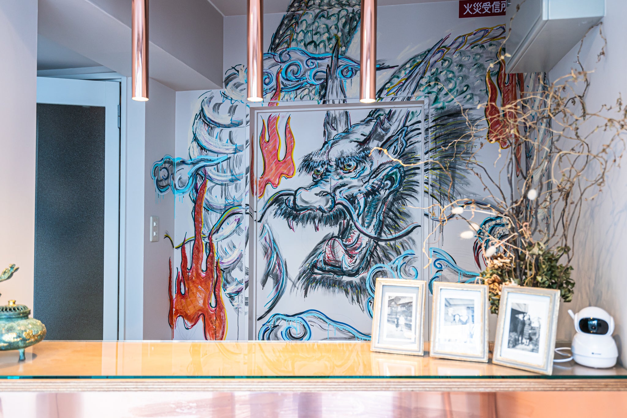 *背景の壁に直接、絵の具で描かれているのは第一弾アーティスト亜鶴氏のウォールペイントの作品です。