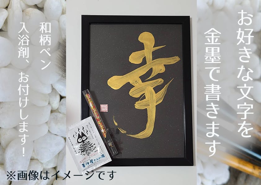 ・10000円 B4サイズにお好きな文字を金墨で書きます!(1~3文字まで)/額はブラックのみ+和柄筆ペン中字1本(和柄のベースカラーをお選び頂けます)+墨の入浴剤1袋+メッセージカード/2限定