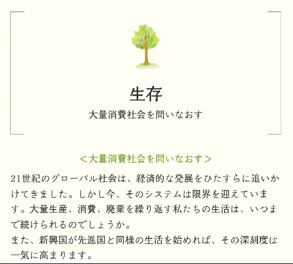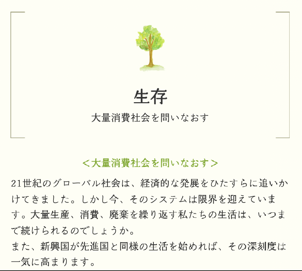 「生存の壁」とは、使っては捨てる生活習慣、つまり大量生産・大量消費社会がもたらす地球的危機です。成長の名の下に、世界はひた走ってきました。先進国の経済成長率は天井にぶつかり、伸び率が下がっていても、その考え方は変わっていません。そして、それを発展途上国が追いかけ始めているのが現代です。