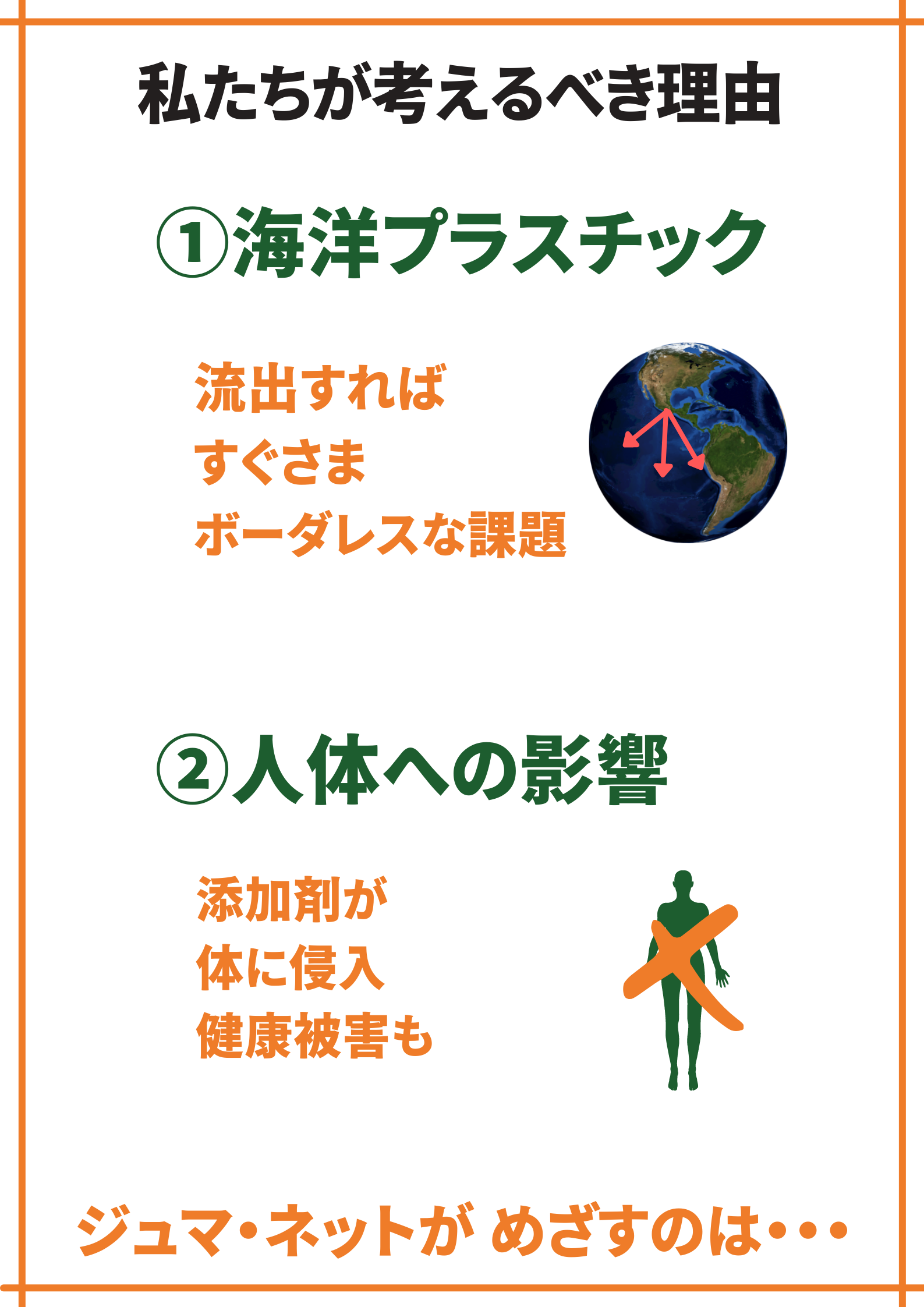 ジュマ・ネットは、ゴミを減らし、できるだけリサイクルして今あるものを使うこと、そして長期的には、使用を減らしていくことを当面の目標だと考えています。完全にゼロにすることは、もはや現代社会においては不可能ですし、利便性を考えれば、どうしても選択を余儀なくされることは多々あるでしょう。私だってその一人です。でも、選べる状況にあるのであれば、誰か大切な人と使うものであれば、せっかくであれば安全で、長く使えるものを選んでいこう。これが私たちなりのスタートだと考えています。
