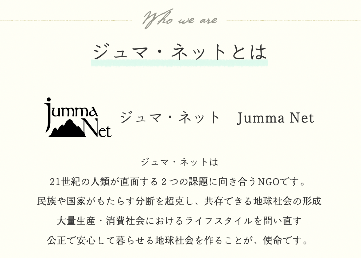 ジュマ・ネットは、2002年から活動を行うNGO(非政府組織)です。バングラデシュ南東部における少数民族抑圧の現状に問題意識を抱き、有志で活動が始まりました。現在はバングラデシュ、インドなど南アジア地域の平和構築、人権問題に取り組むと共に、この度新たに大量生産・消費社会への問いかけを行なっています。ジュマ・ネットがこれまで構築してきたネットワークを活かし、途上国と日本の一本の線でつなげてこの問題も考えていきます。