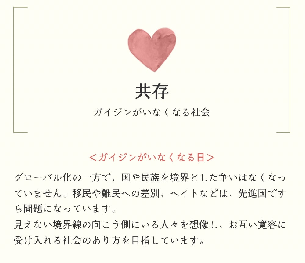 「共存の壁」とは、民族や国民の枠に囚われ、他者を差別したり、権利を奪い合うことを言います。例えば、外国人への冷遇、差別感情などは、その典型です。そしてそれは、これまで数多くの争いや人命を奪う事件にまで発展してきました。20世紀の人類はついにそれを解決できぬまま。私たちの時代へと遺されています。