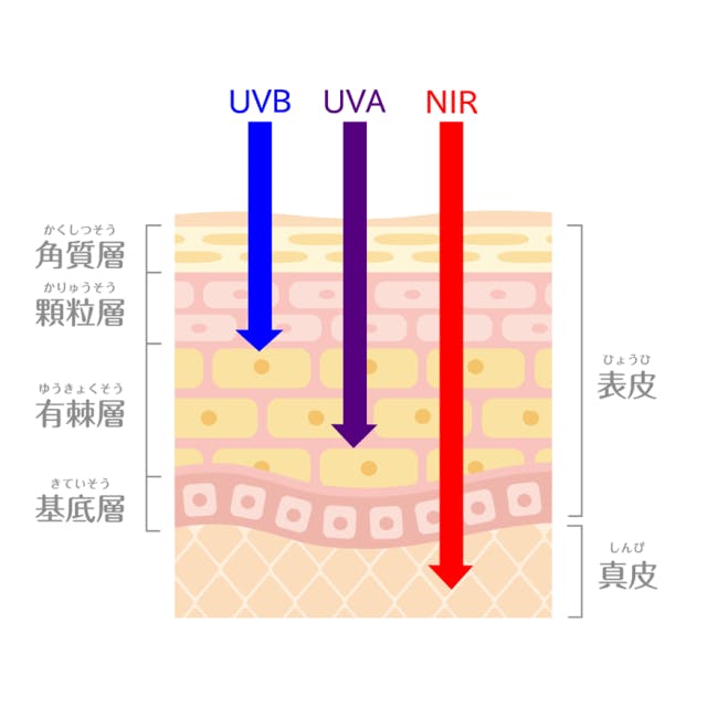近赤外線は紫外線より波長が長いため非常に貫通力が強く、皮下組織まで到達します。
