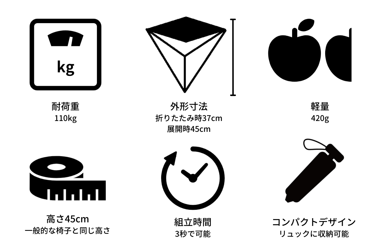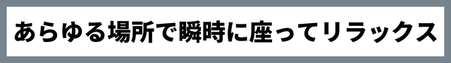 どこでも使用できるよう簡単に素早くセットできる構造を考え抜いた結果、最速3秒での組み立てを実現しました。瞬時に折りたたむことも出来るので隙間時間にも座ってリラックスすることができます。