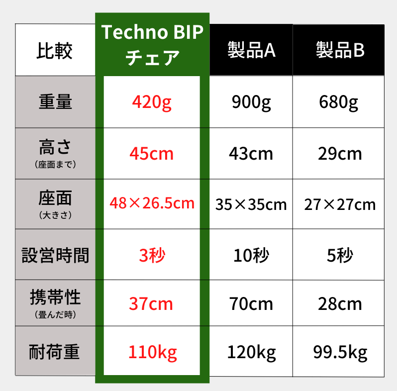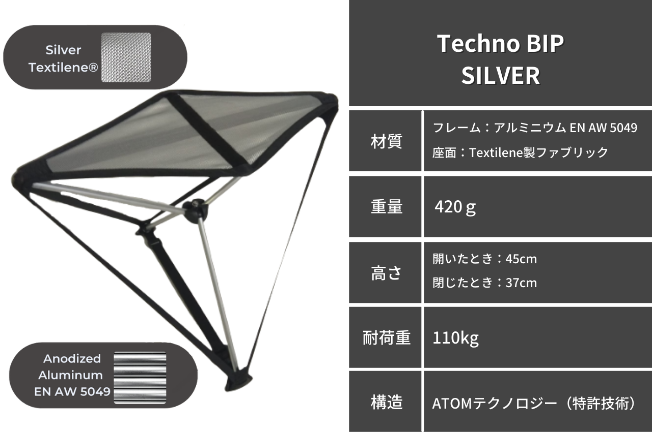 従来の折りたたみチェアは持ち運びに不便な重さ、または軽くても十分に高さの無いものが多いですが、Techno BIPは同じサイズの折りたたみチェアの中で最高クラスの軽さを誇り、椅子と同様の高さで座れることで、長時間快適に過ごすことが出来る折りたたみチェアです。