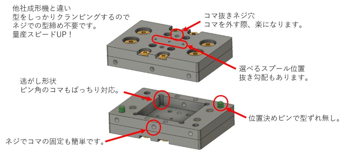 従来の射出成形機には金属を削り出した金型が必要であり、この金型の作成のハードルが高いことが難点でした。