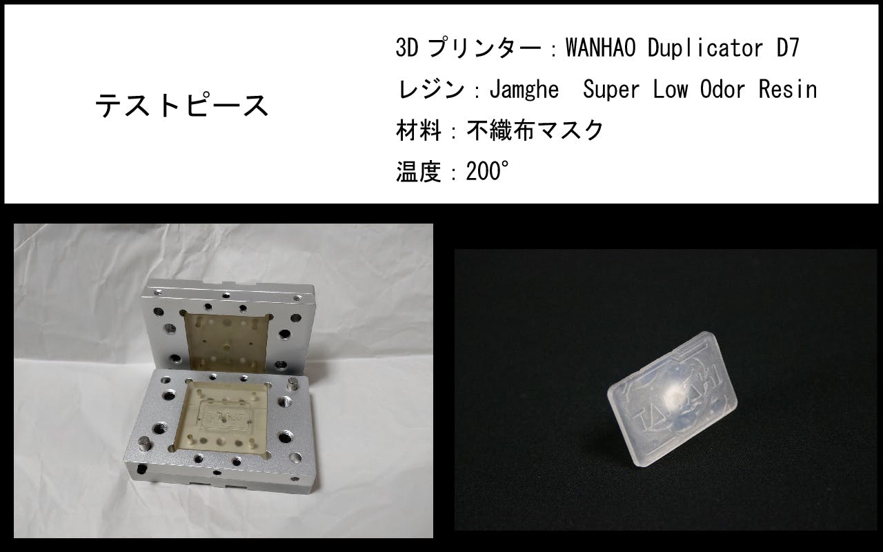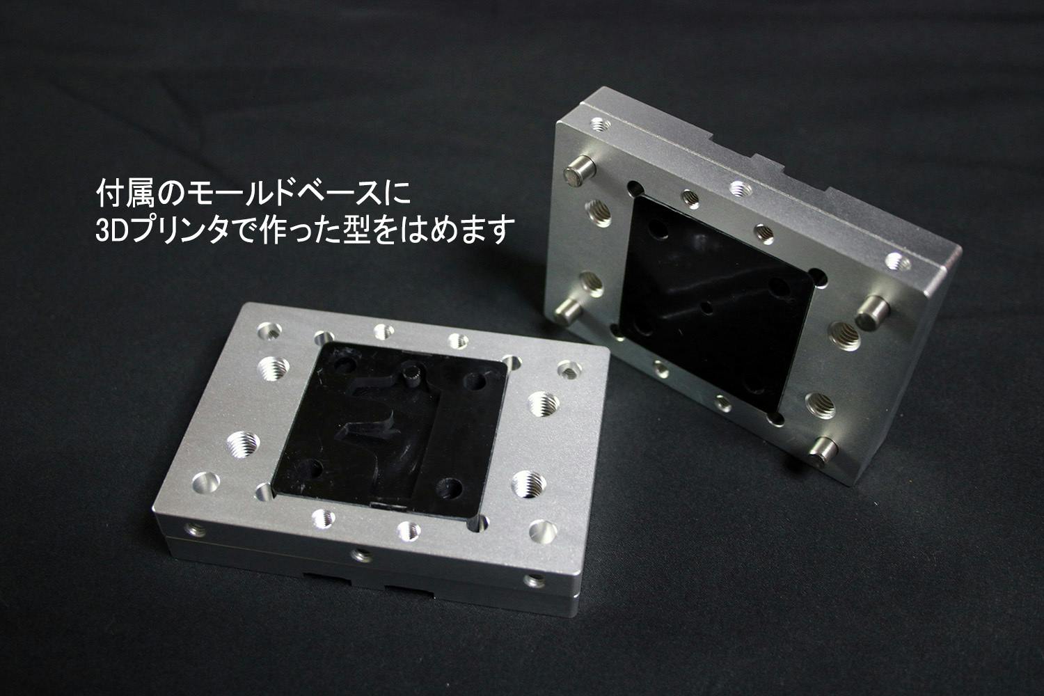 せっかく成型機をキット化できても金型を作れないと意味がない。そこで光造形機で3Dプリントした型をなんとか利用できないかと試行錯誤し、3Dプリント型で成形可能になるモールドベースもキット化しました。