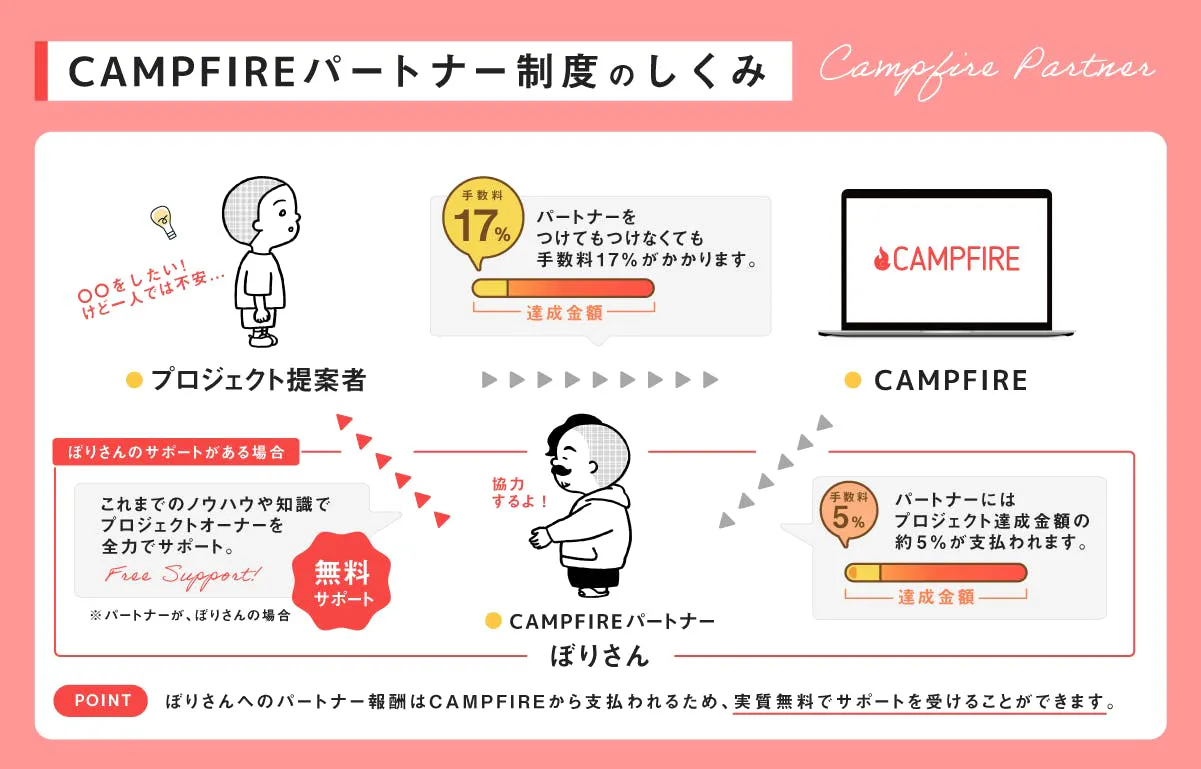 パートナーに相談してもしなくても、起案者がCAMPFIRE社に支払う手数料は変わらないため、相談しないメリットがないと言えるほど便利なシステムです。