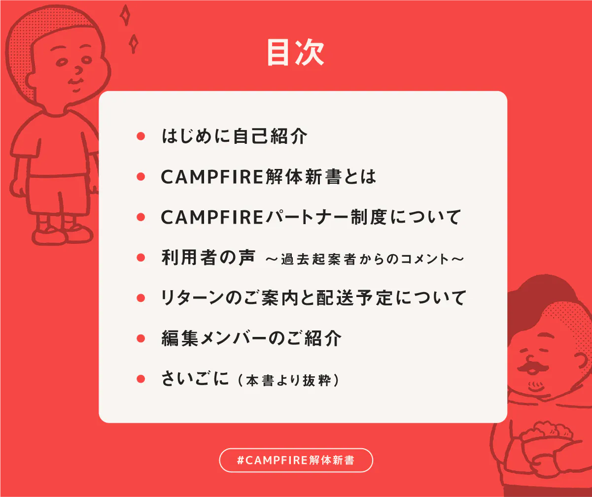 CAMPFIRE解体新書は、前書き「はじめに」と後書き「さいごに」に加え、以下の内容で執筆しています。
