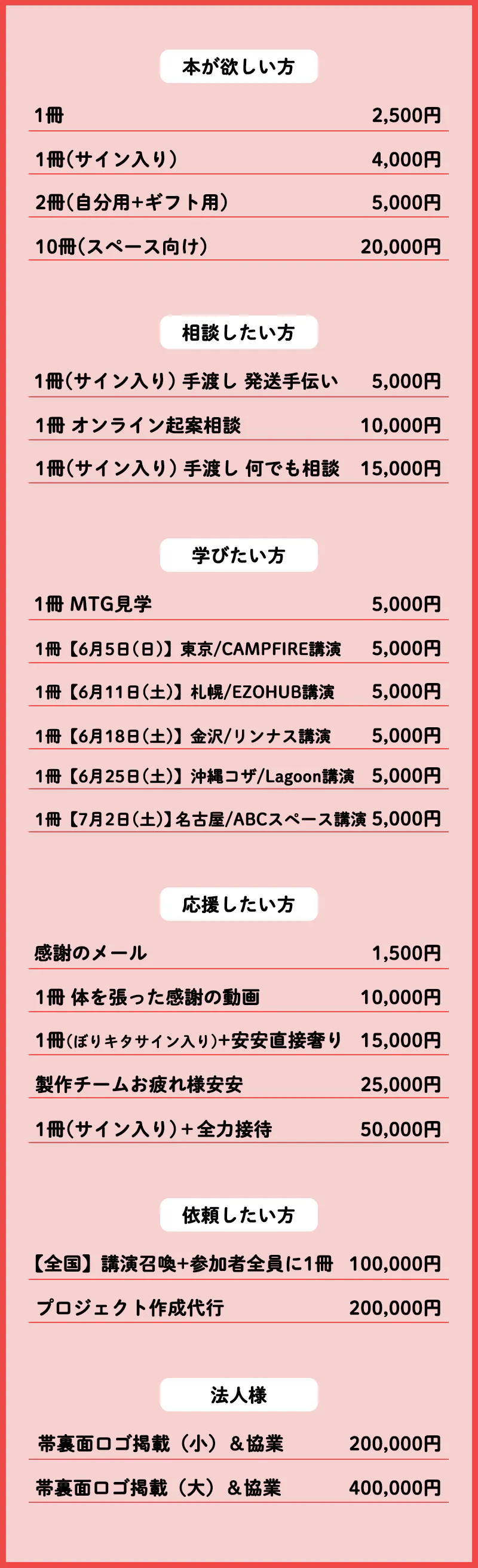 当プロジェクトのリターンと致しまして、完成した書籍をお届けする他、ぼく自身への個別相談、全国各地で開催するクラウドファンディングセミナーに参加できる権利をご用意させて頂きました。