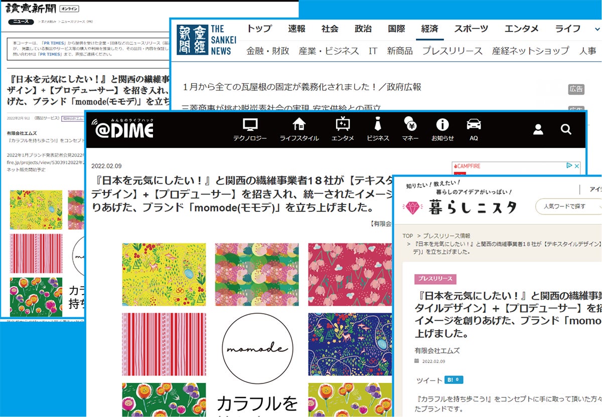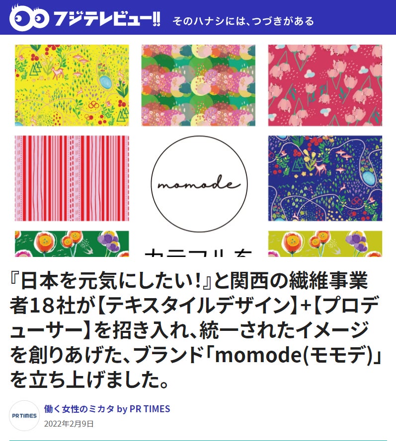 ご覧いただき有難うございます。繊維業界最大の新聞『繊研新聞』に1月に引き続き”momode”の活動を改めて掲載して頂きました。繊研プラス多くの繊維事業者が”脱下請け”を目指していますが魅力あるブランドを構築するためには多くの品揃えが必要となり単独ではハードルが高く大変難しいことです。”momode”の取り組みは業界でも大変珍しい取組みです。『日本を元気にしたい!』という想いから始まり『カラフルを持ち歩こう』をコンセプトに多くの事業者が集結しブランドを構築を目指しています。(2月18日現在、17社→19社に増えました)多くの方からの応援、ご支援が私たちの励みになります。引き続き宜しくお願い致します。