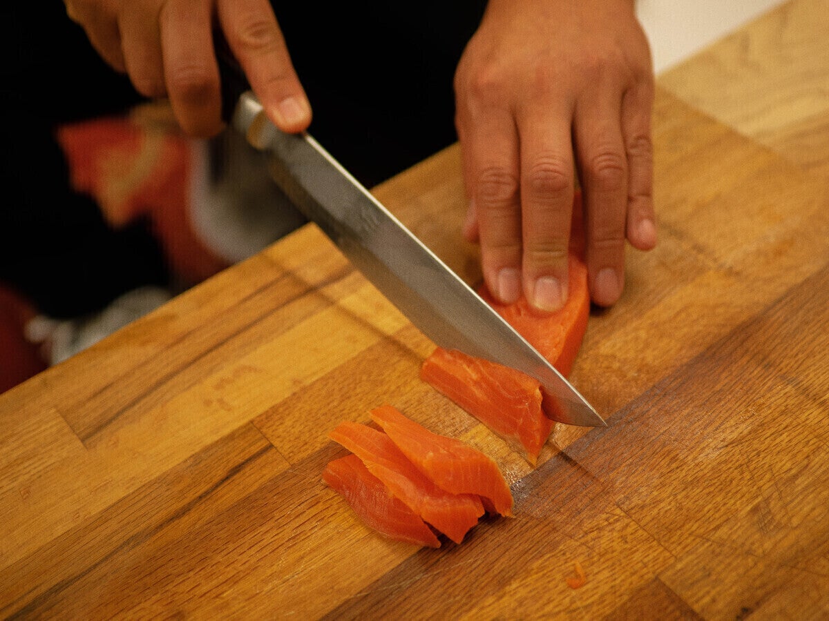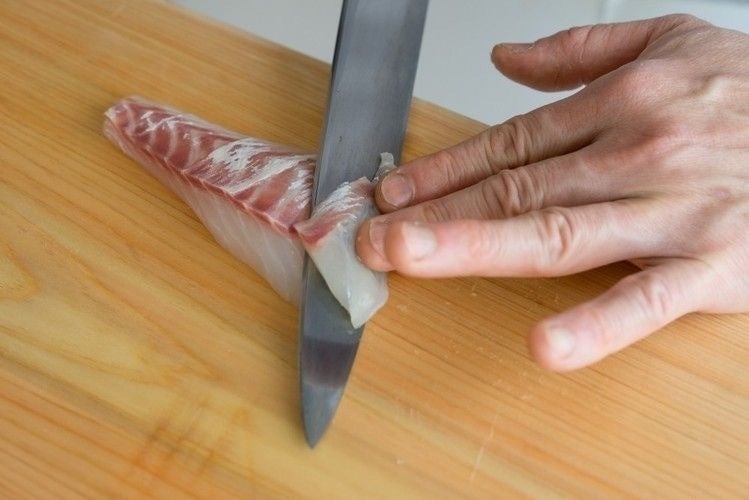 刺身をおいしく切るには包丁の刃元を刺身に当てて