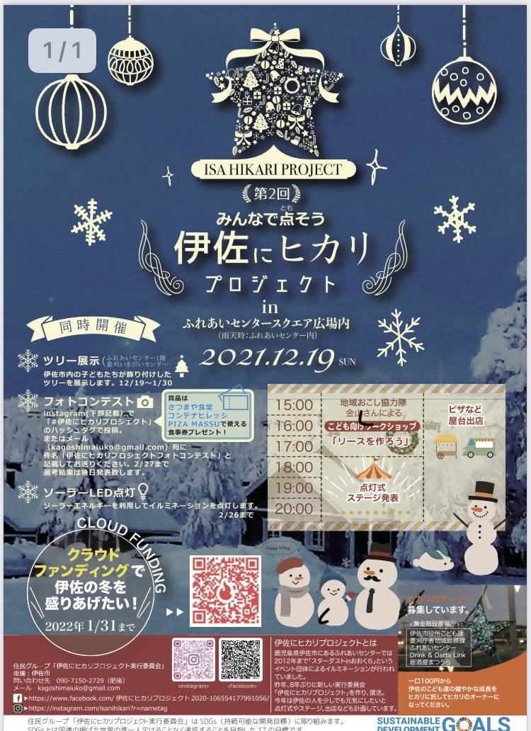 2021/12/30 01:19無事に点灯しました★2021.12月18日に朝10時よりイルミネーションの取り付けを行いました。ふふれあいセンタースクエア広場にある木はボランティアの皆さんにチームで取り付けをしていただきました。工房あけぼのさんや伊佐駅伝チーム、伊佐に特別支援学校をつくる会などそれぞれ飾りも持ち寄って自由に取り付けをしていただしました。こちらはソーラーLEDイルミネーションです★ふれあいセンター屋上からの電飾は瀬戸口電設様がしてくださいました。寒空のなか、高いところで作業される姿に感心することでした⭐︎高校生が噴水をイルミネーションしてくれたり、伊佐市内から使っていないイルミネーションを集めたリサイクルツリーも飾り付けました!高校生チームでフォトスポットの羽根コーナーも作成!芸術系地域おこし協力隊金山さんチームのフォトスポット虹は大作になりました!取り付けを行いながら中学生や高校生と大人が話しながら取り付ける姿に伊佐でもなんだか少なくなっていた世代を超えた交流に温かい気持ちになりました☆12月19日15時から出店、子ども向けワークショップなどをしました。ふれあいセンター内で、リースづくり、伊佐市で活動しているパンフラワー教室のみなさんによる干支づくり、伊佐市青年団によるストラックアウトなどでふれあいセンターが賑わいました♪こどもだけで遊びに来た子、親子で作られた方、皆さん嬉しそうに作品を持ってかえられる姿にこちらもうれしくなりました!大口明光学園高校のインターアクト、一粒会の皆さんがボランティアで会場のお手伝いをしてくれました。ふれあいセンターステージには伊佐市内の保育施設に飾り付けを協力してもらったツリーを展示しました。菱刈地区は図書館に4つ展示しました。出店は今回は7店舗きてくださいました!お菓子や紅茶やいろんなお茶、コーヒー、カレーやりんごあめに、イカ焼き、ピザ。写真を撮るワンコイン撮影会や青年団による豚汁のふるまいもありました!会場には暖をとる場所として炭火コーナーもボランティアでしていただき、子ども達に焼きマシュマロのふるまいもありました。またB型支援いさ工房さんにに協力していただいてガチャガチャを設置。出店されたお店のクーポンを入れました。また缶バッジも制作していただき販売しました!点灯式では高校生が司会を、点灯にあわせて実行委員である高校生2人がファンファーレをふき、「みあげてごらん〜」を演奏してくれました☆明光学園サイエンスクラブに依頼していた自転車で発電するツリーが無事に完成、一緒に点灯しました。その後、明光学園ハンドベル演奏、こどもたちによるダンス、人吉からきてくれたアフリカン太鼓、チームちむどんがパフォーマンスをしてくれました! こどもたちが生き生きと踊る姿に感動!「イベントってやっぱりいいね」との声をたくさんいただきました。気温が一桁の寒い中、400人以上の方に来場していただきました‼実行委員以外に中学生や高校生が当日ボランティアとして受付なども担当してくれました。片付けには高校生が手伝います!と駆け寄ってきてくれました(涙)ただイルミネーションでホッとしてほしいとの思いで始めた「伊佐にヒカリプロジェクト2021」でしたがたくさんの方の協力をいただき、とてもステキなイベントになりました!イベントをして、知らなかった人たちがここに集まったことで新しい出会いやつながりができたことなど、想定してなかった素晴らしいことがたくさんありました!子どもたちのツリーは1月末まで、イルミネーションは2月末までの予定です。支援していただいた皆さん、無事に点灯式ができました!ありがとうございましたo(^-^)oぜひともまだまだたくさんの方に支援していただけたらと思います!どうぞよろしくお願いします! もっと見る