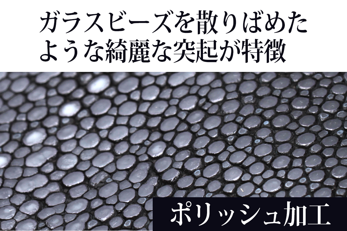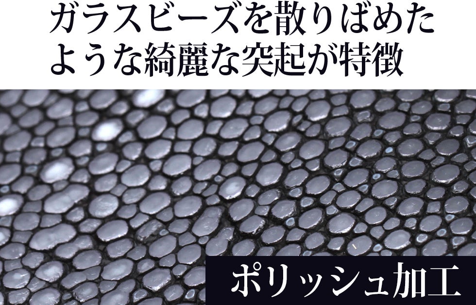 一般的な革とは異なり、エイ革は使い込むごとに光沢を増し、いつまでも綺麗な状態を保ちます。※ 天然のエイ革を使用しているため、革の模様やスターマークには個体差がございます。