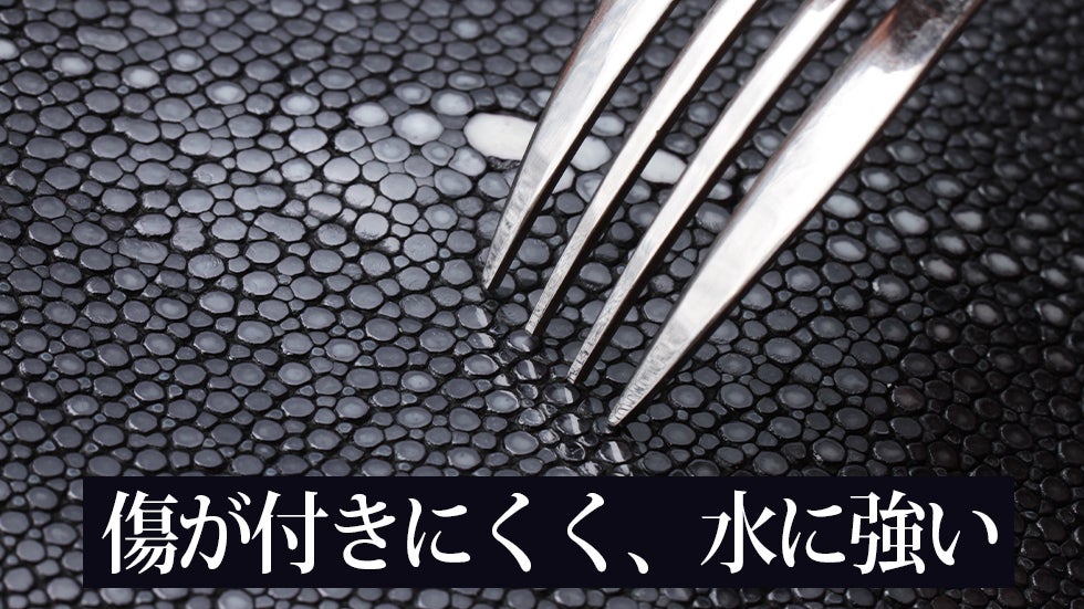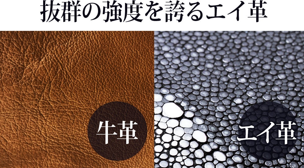 エイ革のガラスビーズのような突起の正体は『リン酸カルシウム』。私たちの歯の成分と同じです。そのため、エイ革は非常に硬く、高い強度を誇ります。