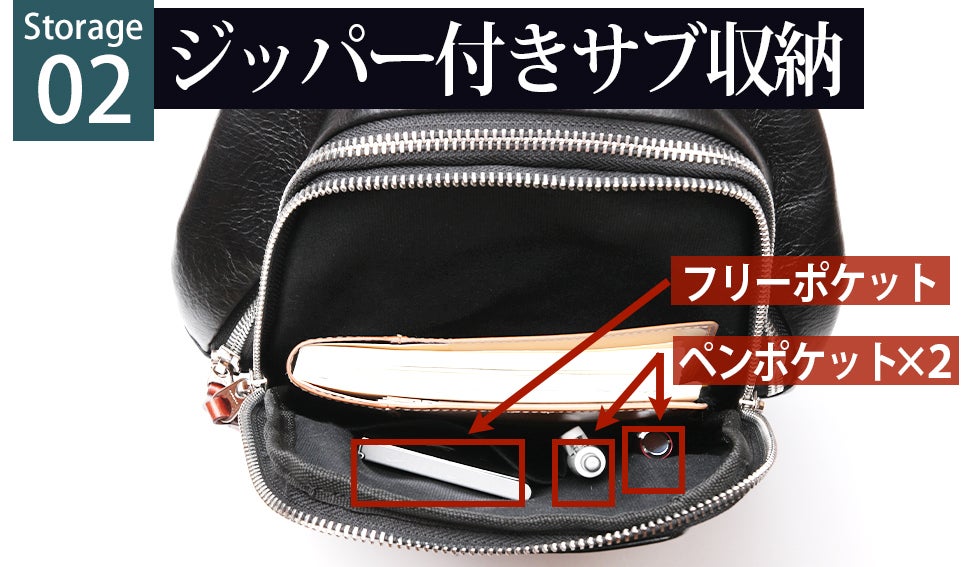 ペン2本やカードケース、手帳などの収納に大活躍のジッパー付きサブ収納