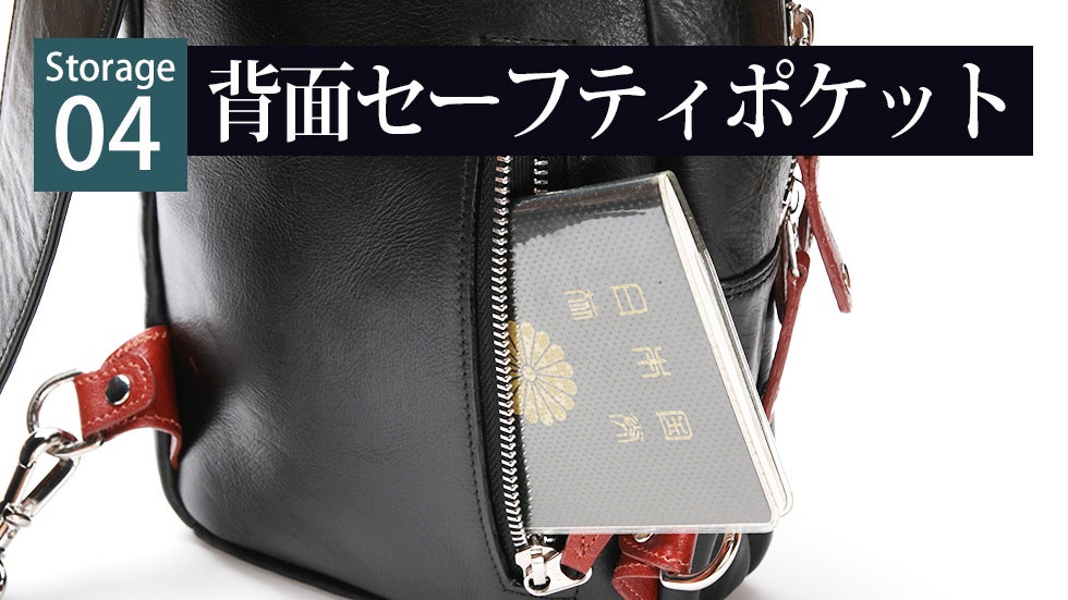 バッグの裏側には、海外旅行などでパスポートなどの大切な物を盗難から守るセーフティポケットも付き