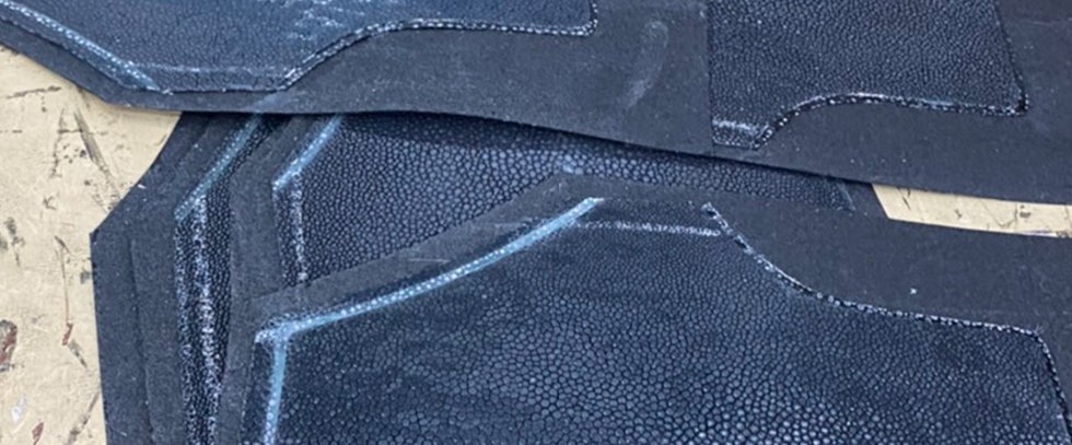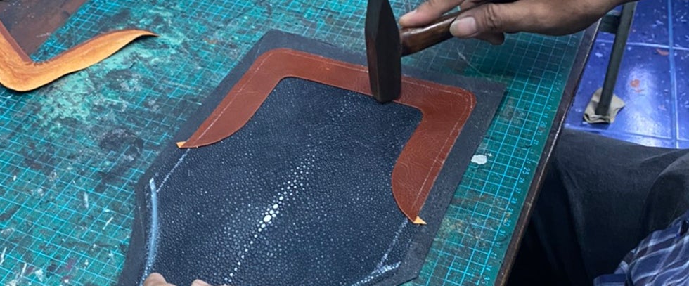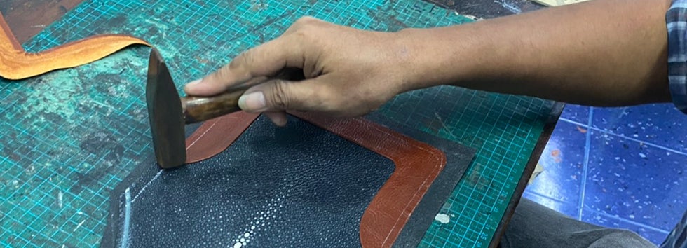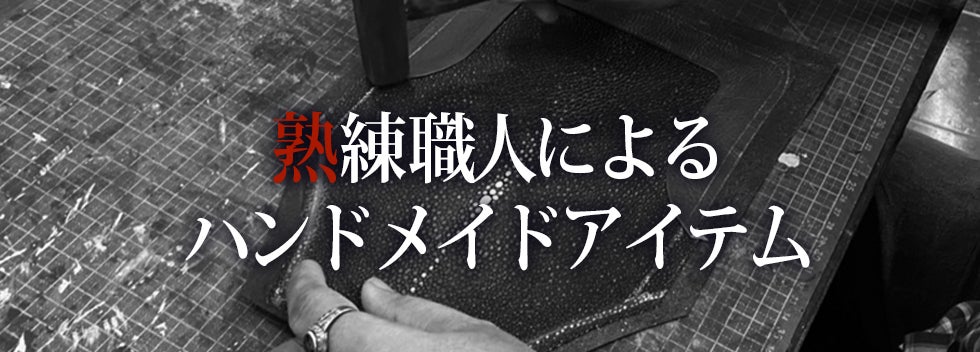 非常に硬いエイ革の加工には特別な技術を用いるため、熟練のエイ革職人の繊細な技術も魅力ポイント。