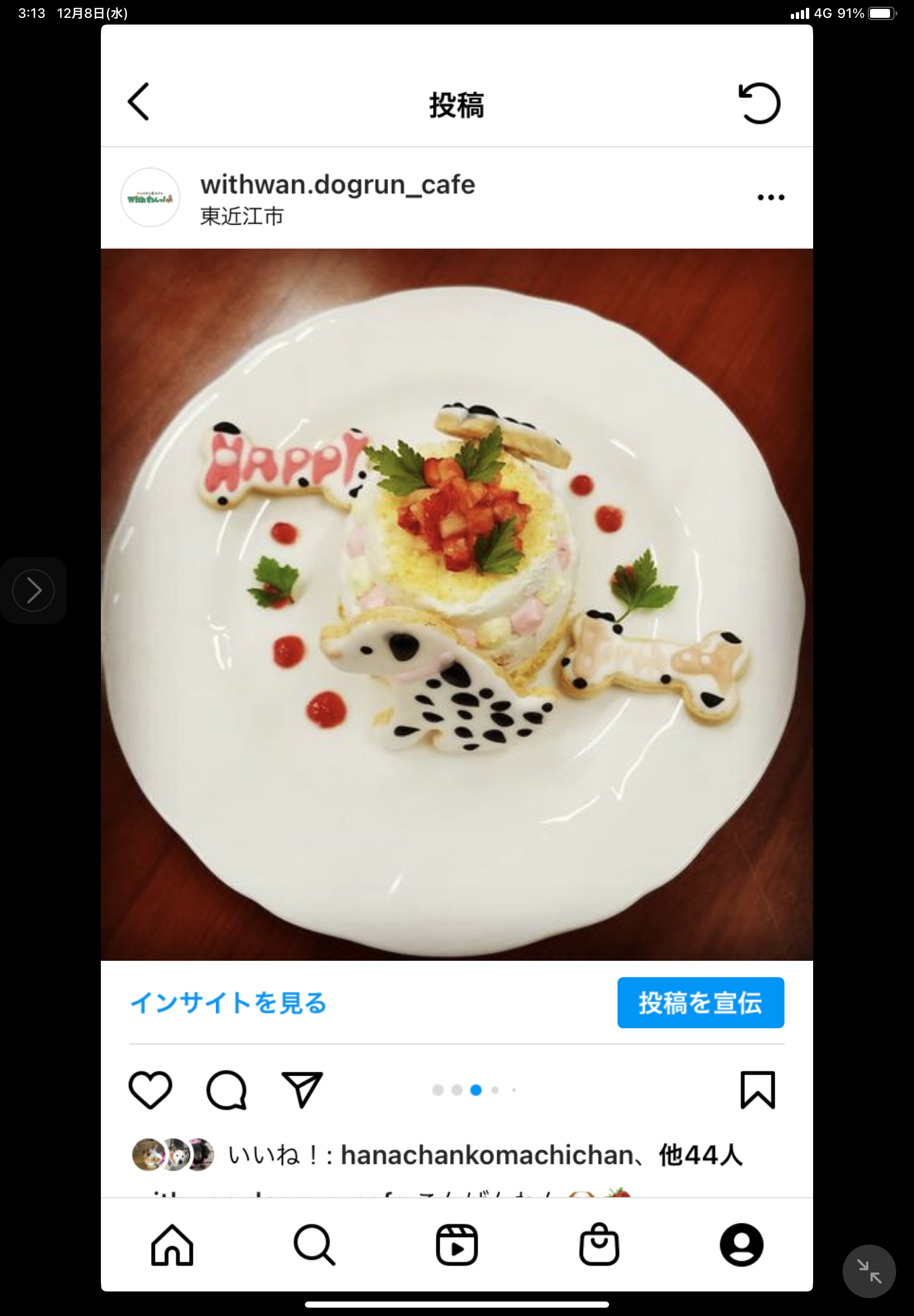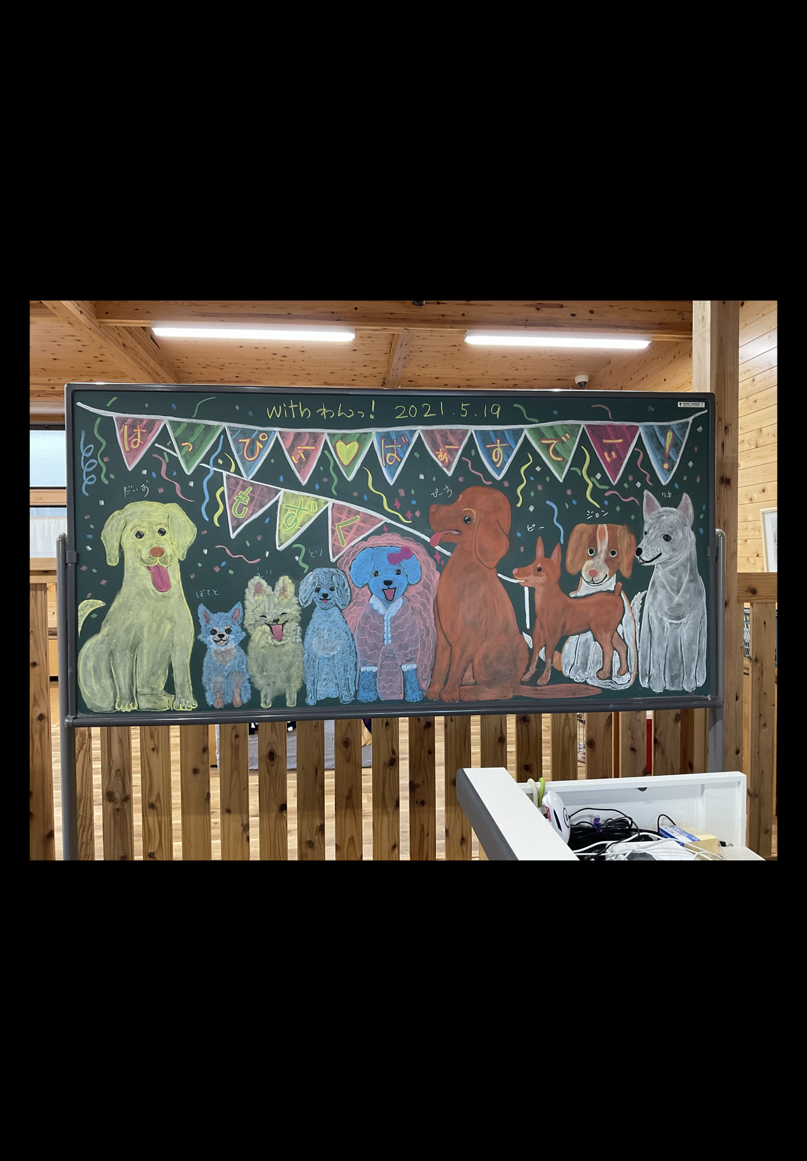中でもご好評いただいているのが、アニバーサリーケーキ。人間もわんちゃんも一緒に食べられるケーキをご用意させていただいています。予約制ですが、お誕生日だったり、家族になった記念日などにご注文いただいて、ご来店いただいた時には、ウエルカムお誕生日ボードとして黒板アートの大きな絵でお迎えします。ケーキはテイクアウトももちろんしていただけますし、店内パーティーもしていただけます。プライベートパーティーとオープンパーティーがあって、オープンパーティーでは、SNSなどで呼びかけて、不特定多数の方にご参加いただくパーティーです。賑やかで、新しいお友達ができます。