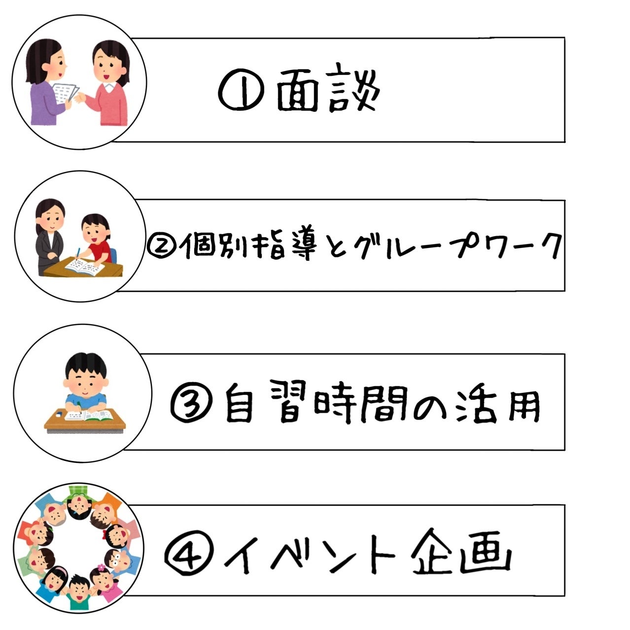 月4回の個別学習指導と1回の少人数授業(グループワーク)を行います。個別学習は、教室に来てもらって行うこともできますし、希望者へはこちらから訪問して指導を行うことも可能です。また、平日午後14:00~18:00の間は、自由に教室に来て勉強することができるので、学校帰りに寄って宿題をしてから帰宅することもできるようにします。毎日少しの時間でも勉強に触れる習慣をつけさせたいというのがねらいです。塾とは違い、ただ教えるだけではなく保護者とともに子どもにとってよりよい道を切り開いていけるように支援していきたいと思います。また、グループワークでは、まずは少人数の集団で学び合いの授業を行うことで、子ども同士で課題解決ができる練習をすることで、学校生活を送ることへの自信をつけさせたいと考えています。