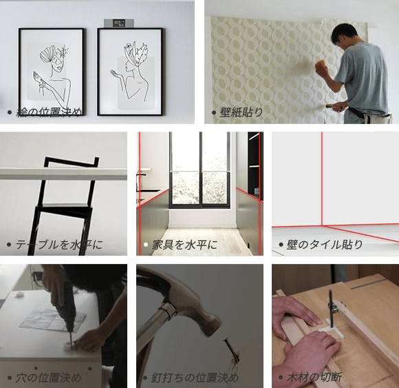 部屋の家具などを左右対称に置きたい時などにも、LI 1レーザー角度計は大活躍!本体前後から同時にレーザーで十字マーキングを投影できますので、より早く作業を完了できます。
