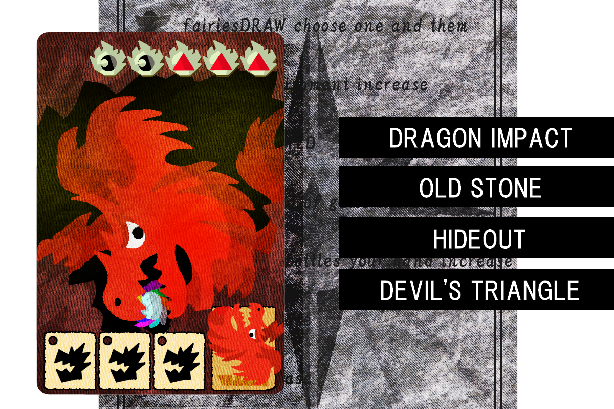 ドラゴンインパクトは4枚ともドラゴンが描かれたカードです。「決戦のドラゴンインパクト」は2足歩行のレッドドラゴンが描かれたカードです。基本セットのレッドドラゴンは翼竜系のドラゴンなので別種のドラゴンとなります。ファンタジーといえばドラゴン!ドラゴンといえばレッドドラゴンという感じで勢いだけで描きました。口に咥えているのは真実の鏡というシンボルで失われた秘宝のひとつです。何故、このドラゴンが咥えているのかは理由があるのですが・・・。ヒントは女性のドラゴンです!