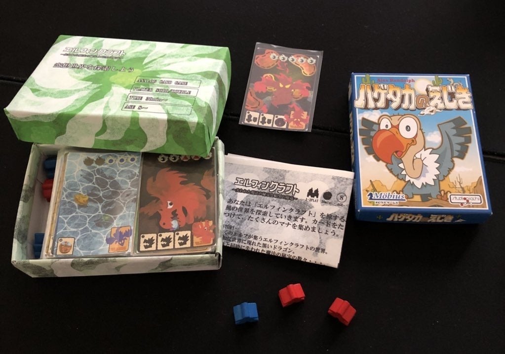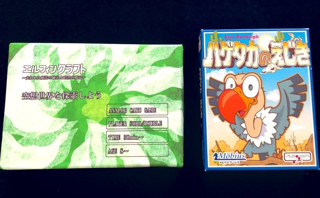 ハゲタカのえじきはサイズ感が分かるように置いて比べてみました。ハゲタカのえじきより大きい箱サイズですが、予定どおり小箱で持ち歩きしやすいサイズにしようと思っています。