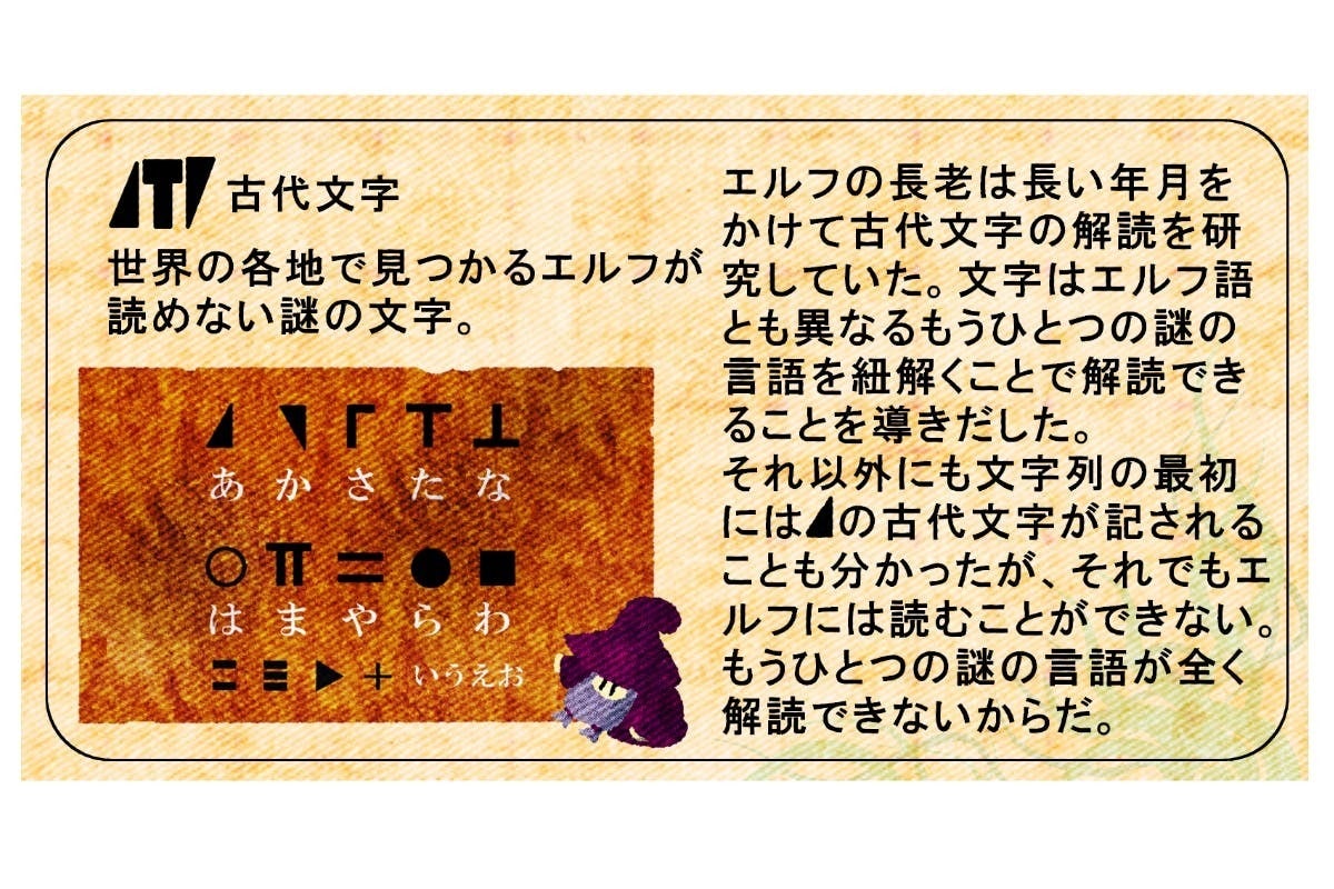 世界観のフレーバーの一つとして古代文字がありますが、その古代文字をゲーム内のオマケ要素としてみました。文字を解読する事で古代文字の謎に少し触れることができます。
