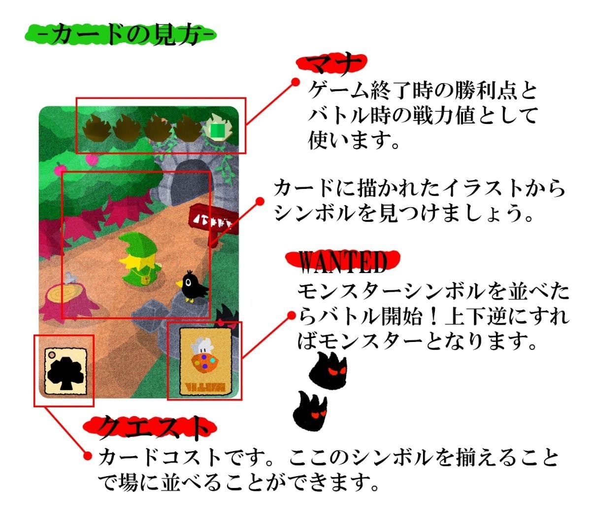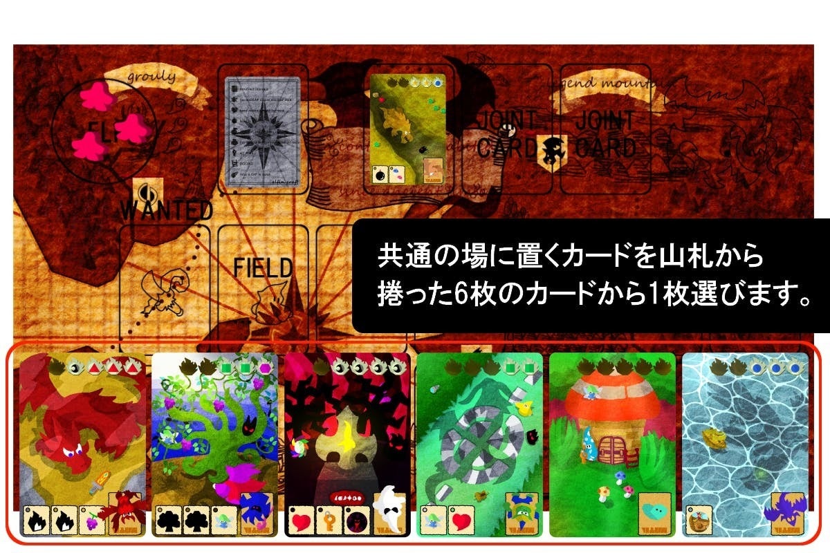 カードイラストは分かったからゲーム内容をもっと知りたいという方向けにゲーム内容の手順を紹介します。空想世界を探索するゲームの内容が伝わればと思います。