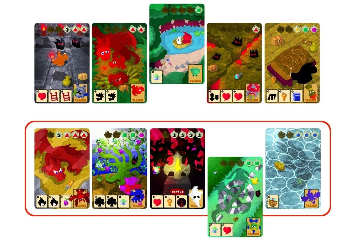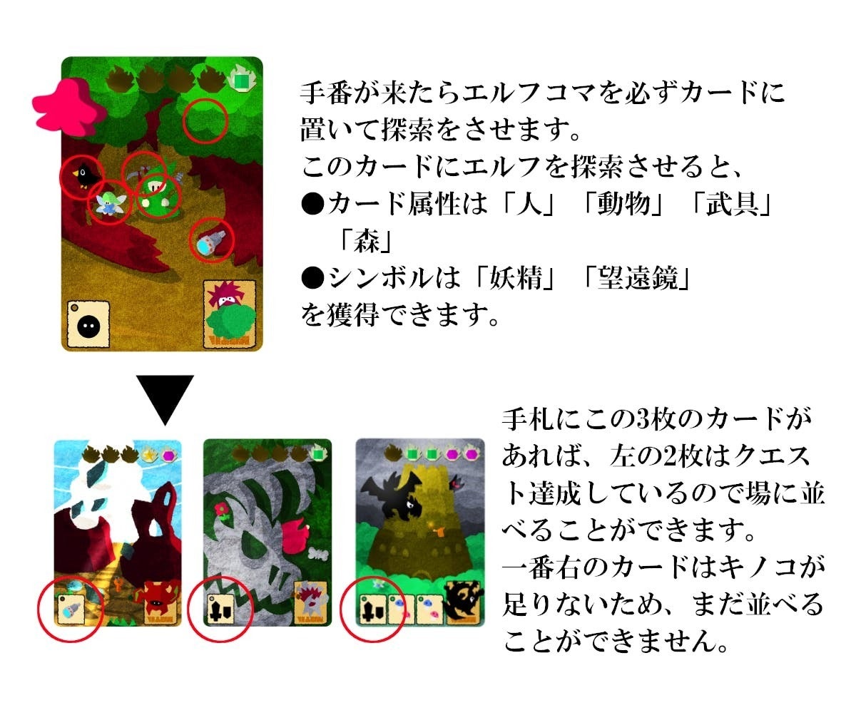エルフを探索させてシンボルを揃えることで手札をどんどん並べていきます。並べることでまた探索する場所が増えていきます。
