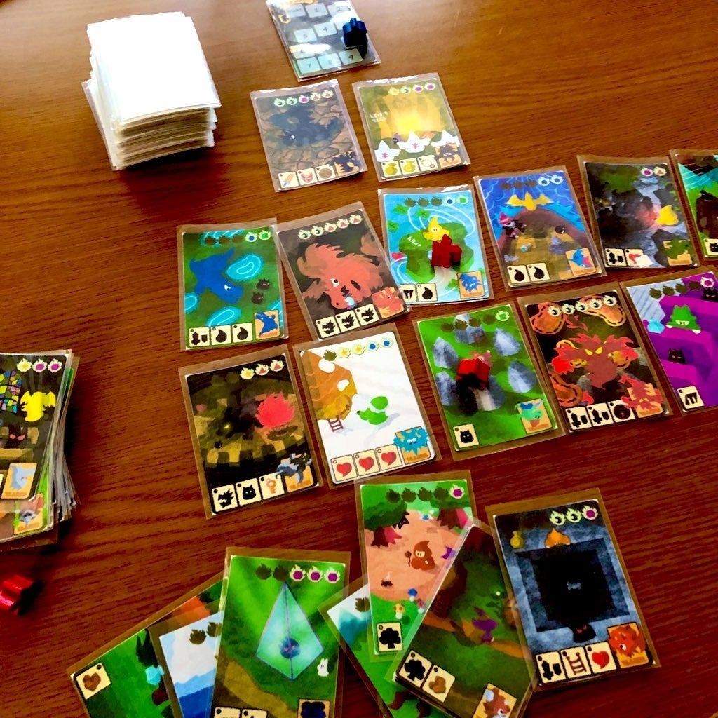 他にもモンスターとのバトルや経験値稼ぎ(同じ所をぐるぐる回る=捨て札ふえる=捨て札が点数になる)などデジタルゲームのRPGのエッセンスをカードのやりくりだけで再現できないかに挑戦しています。