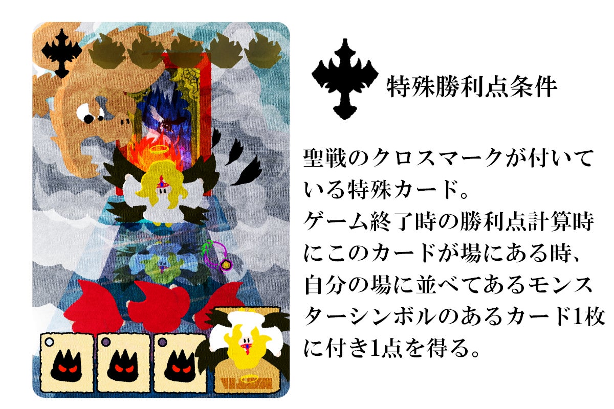 聖戦のクロスマークやクエスト(カードを並べるための条件)に何故モンスターシンボルが必要なのかは世界設定的な理由があります。カードごとに隠されたストーリーを想像しながら遊んでいただければと思います。