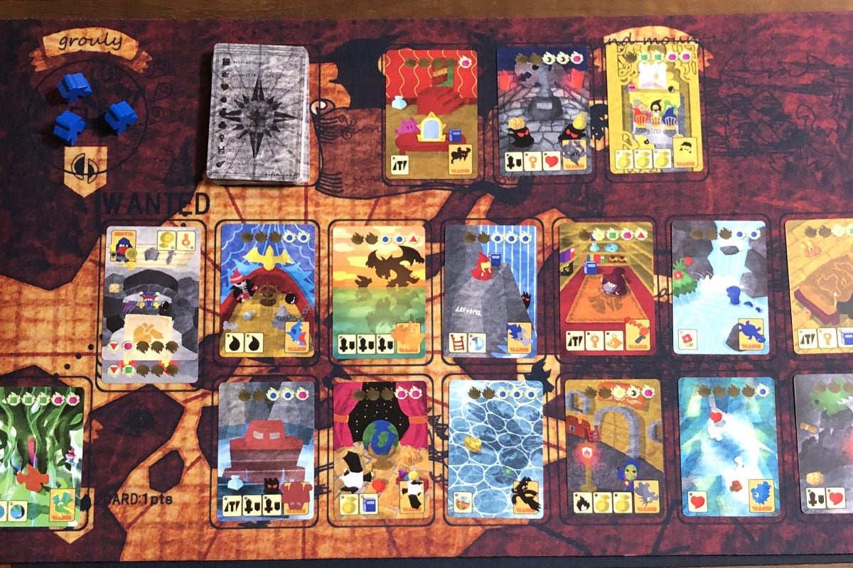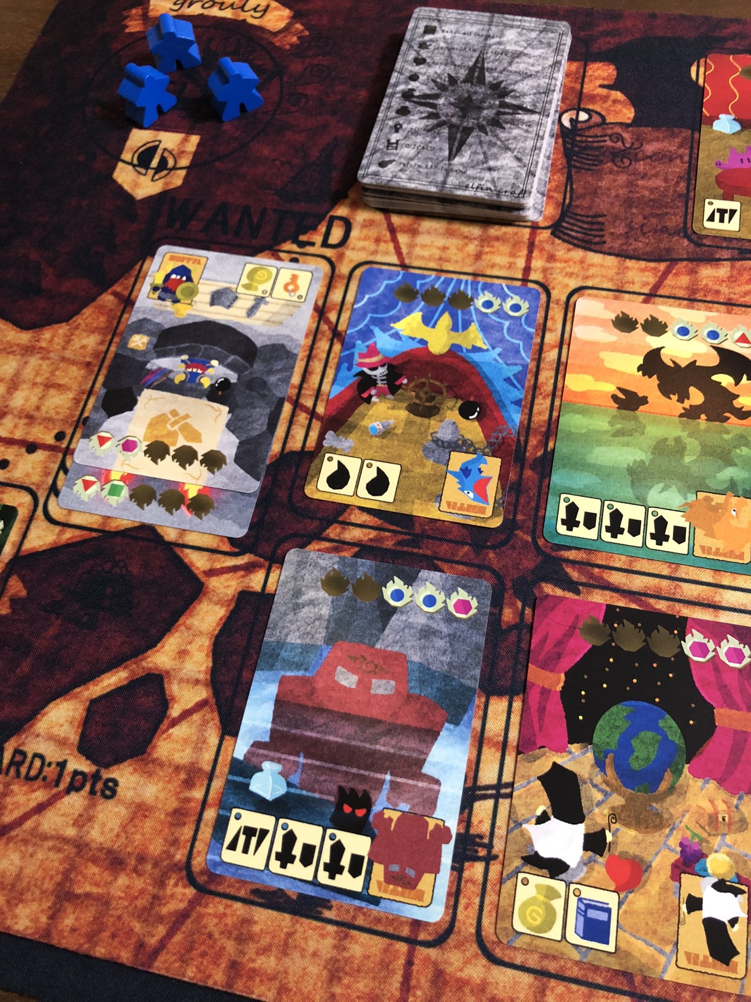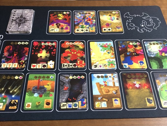 カードを並べてみるといかにもカードゲームっぽく個人的にはとてもワクワクしています。ゲームマットがなくても遊べますがカードの保護や遊びやすさでゲームマットがあるとやっぱり良い感じです!