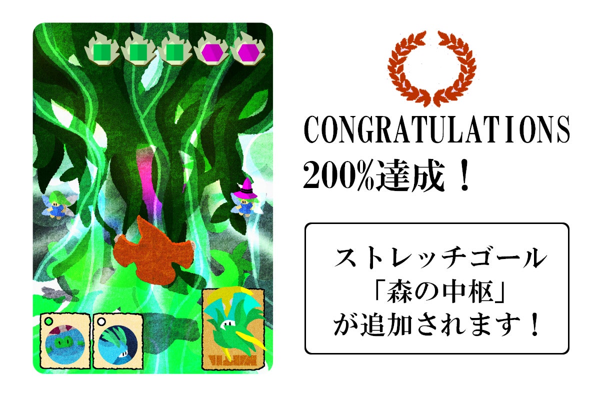 2022年11/18日に開始した『エルフィンクラフトプロジェクト』は本日目標金額200%を達成しました!200%の手前で足踏みしておりましたが無事に突破することができました。ありがとうございます。プロジェクト開始初日は4名の方からご支援をいただいたものの、スタートダッシュができずに正直、とても悔しい思いをしました。しかし、その後も継続的にご支援をいただき、支援者様がツイッターなどでリツイートや応援をしていただいた効果もあり、常にお気に入り登録が支援者数を上回る形で推移しました。この状況はあと一押しとなる魅力が足りずにお気に入り登録だけするということかも知れませんが、私的には興味を持っていただき応援していただいていると捉えていて嬉しい状況でした。実際にご支援いただいた時はメールにて通知が入るのですが、その時のメール音を聞く時は格別の嬉しさです。有難い気持ちや嬉しい気持ち、適度な緊張と感謝など色々な思いが入り混じり何とも言えない高揚感があります。そんなメール音を何回も聞かせていただき、ついに200%達成が出来ました。本当にありがとうございます。私の中では奇跡としか思えないご支援者様の人数で、それぞれのご支援者様に心より感謝しています。この状況に慢心することなく初心を忘れずにご支援、応援いただいた方々に感謝し、きちんとした完成品をお届けできるよう努めてまいります。最後までエルフィンクラフトプロジェクトを応援していただければ幸いです。「森の中枢」カードは200%達成のストレッチゴールとなる追加カードです。エルフィンクラフトの世界観の根本、何故魔法があるのか?エルフは長生きなのか?の疑問への回答として森の中枢を200%達成の追加カードとしました。エルフィンクラフトの木々は魔力を帯びた魔木ですが、エルフたちも何故、魔力を帯びているのか、何千年もの間、枯れることなく森を形成し成長を続けるのか分かっていませんでした。森の下には天空のようにエルフが住む世界とは別の地下空間が広がり水を浄化しながら木々に魔力を与えていました。地上の汚染された水や土壌を森の中枢のまわりできれいにし、森の中枢のエネルギーに変えて、再び地上へと放出します。地下空間には紫に光る魔力の源があり、宝石のようでもあり生命を宿しているようでもある存在です。森の中枢こそがエルフィンクラフトの世界すべてを形成する生命の源、世界の中心としての役割を持っています。森の中枢には強力な魔力が漂っており、エルフが簡単に宙に浮くことが可能な世界です。地下水も下から上に流れたりと独自の磁場を持っています。そんなイメージでカードを作りました。世界観の作り込みは直接ゲームとは関係ありませんが、こだわりやゲームにかける想いが伝われば幸いです。詳しい世界観や設定はカードフレーバーを補完しているDX攻略本で触れることができます。ゲームルールについて現在、毎日テストプレイを重ねてルールを細かく改変しております。公開している情報とも変化していますが、説明書など更新していきます。ご理解の程よろしくお願いします。ゲームコンセプトの「数字も文字もないカードで探索する」という珍しいテーマ通りに仕上がってきています。捨て札からカードを探したり、カードイラストをジロジロ見ながらシンボルを探したりと空想世界を短時間で探索できる内容となっています。250%ストレッチゴールエルフィンクラフトプロジェクトも残り日数が少なくなってきましたが、最後のストレッチゴール250%を設定させていただきます。ツイッターやCAMPFIREのメッセージで皆様が考えるエルフィンクラフトの世界を教えていただき、カード化します。今までに応援していただいている方のコメントを元に作った、ドラゴンの家族が団欒しているカード、ドラゴンにエルフが乗ったり7つの秘宝があったり要素盛り盛りなカード、幻想的な星空を描いたカードの3枚です。「超巨大な建造物!」「ドラゴンの大群!」「やわらかい感じのイラスト」などイメージをお伝えいただければ、GRANDNOTEの力量に合わせて再現できるイメージを選ばせていただきます。カード枚数は1枚か2枚を追加する予定です。コメントの有無に関わらず何枚かの候補を作りツイッターで候補から選んでいただく形で250%ストレッチゴールのカードを決めさせていただければと思っています。250%という数字的にも日数的にもかなり厳しい目標となりますが、よろしくお願いします。最後まで応援、ご支援をお待ちしております!!GRANDNOTE Twitterアカウント