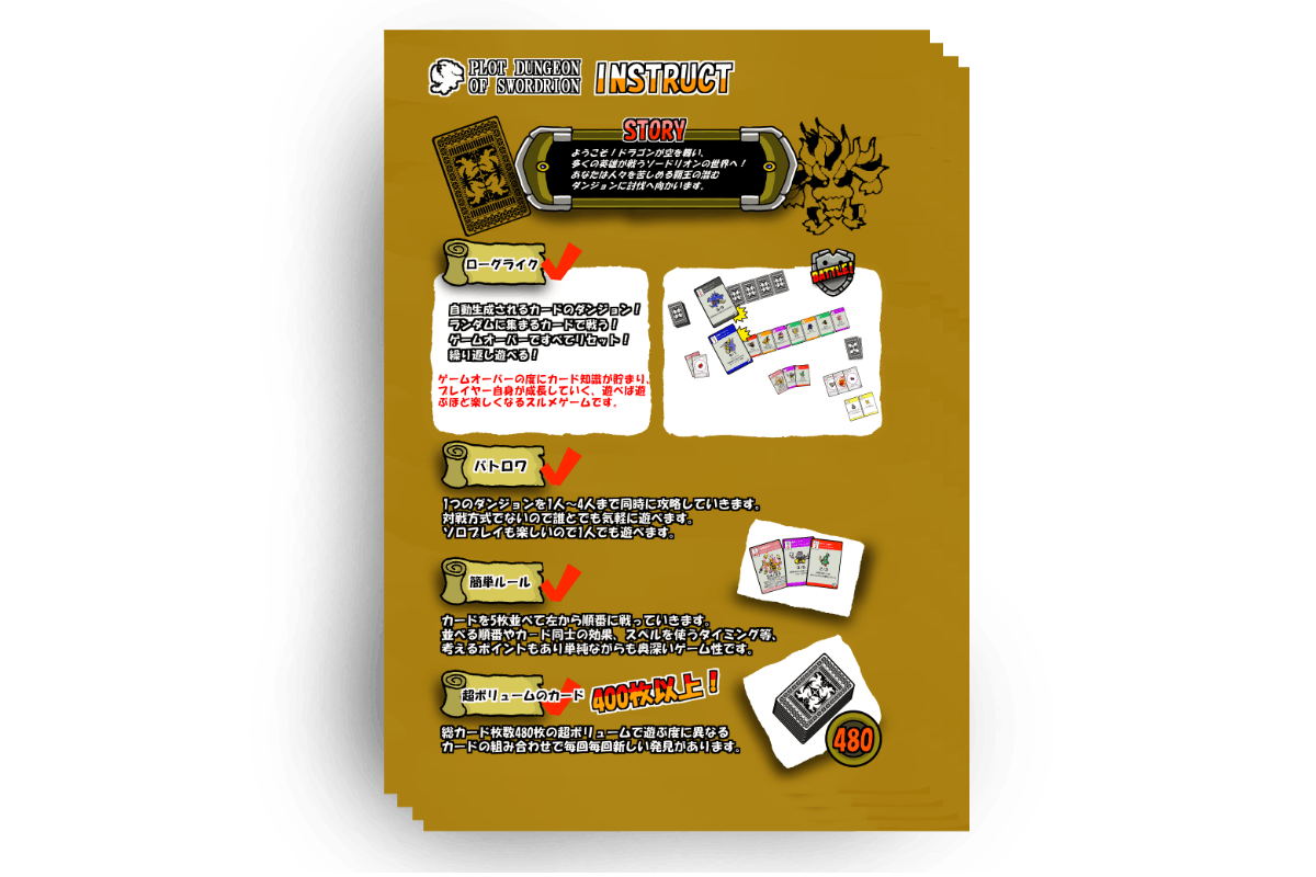 そこでこのプロジェクトにより、480枚ものカードがあるアナログ版ローグライクゲームを完成させようとチャレンジしました。ボードゲームの小箱なら3個は買える価格帯ですが小箱3個以上の面白さを提供できると自負しています。