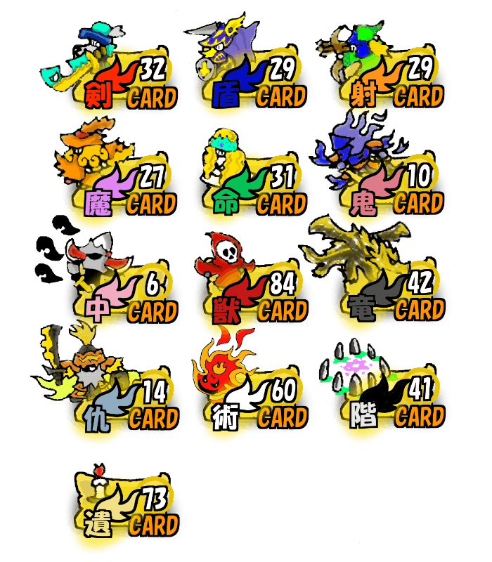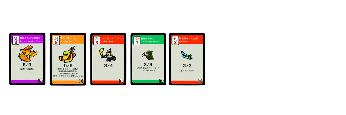 すべてのカードはチビキャラがドット絵風に描かれたデザインとなっています。カードでミニチュアゲームの雰囲気を再現できればとこのようなデザインとなっています。また、ドット絵は未だにスマホアプリのゲームでも使われるほど味のあるデザインで昔のファミコン時代のRPGへのオマージュも込めて、あえてまっすぐな線をギザギザにしたり粗っぽい感じに仕上げています。